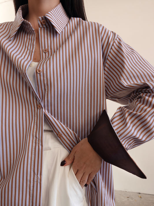 CAMICIA A RIGHE CON POLSI A CONTRASTO - MARRONE 66722
