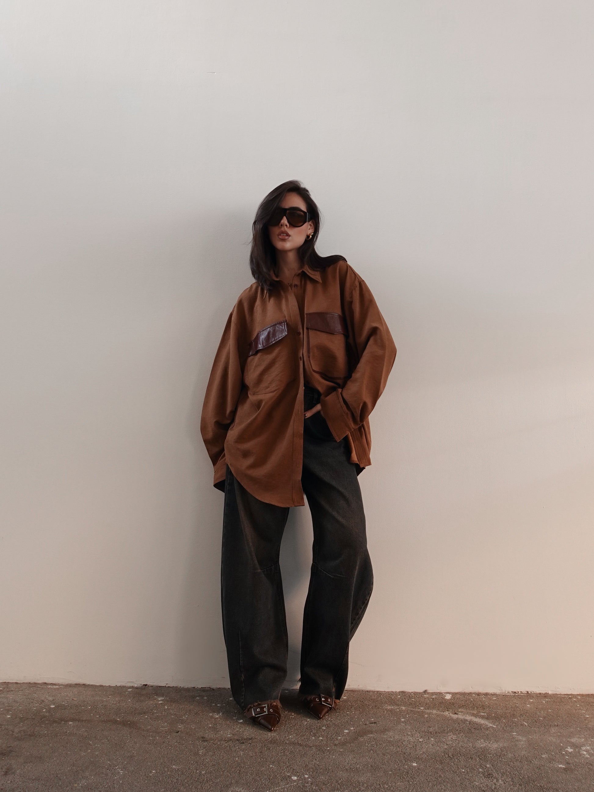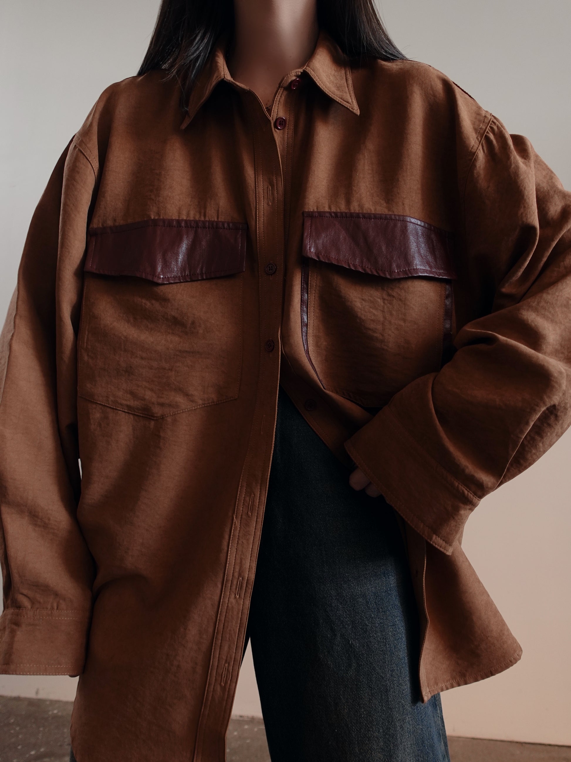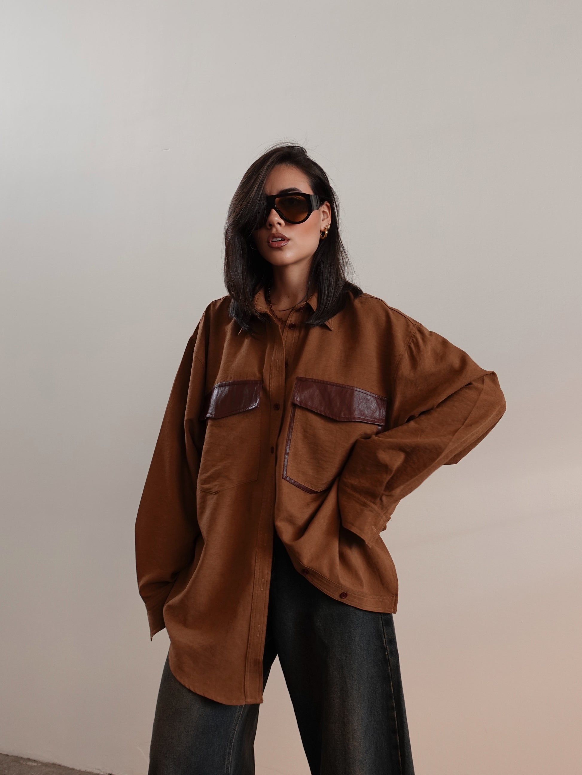 CAMICIA EFFETTO CAMOSCIO CON TASCONI IN ECOPELLE - CAMEL 3478