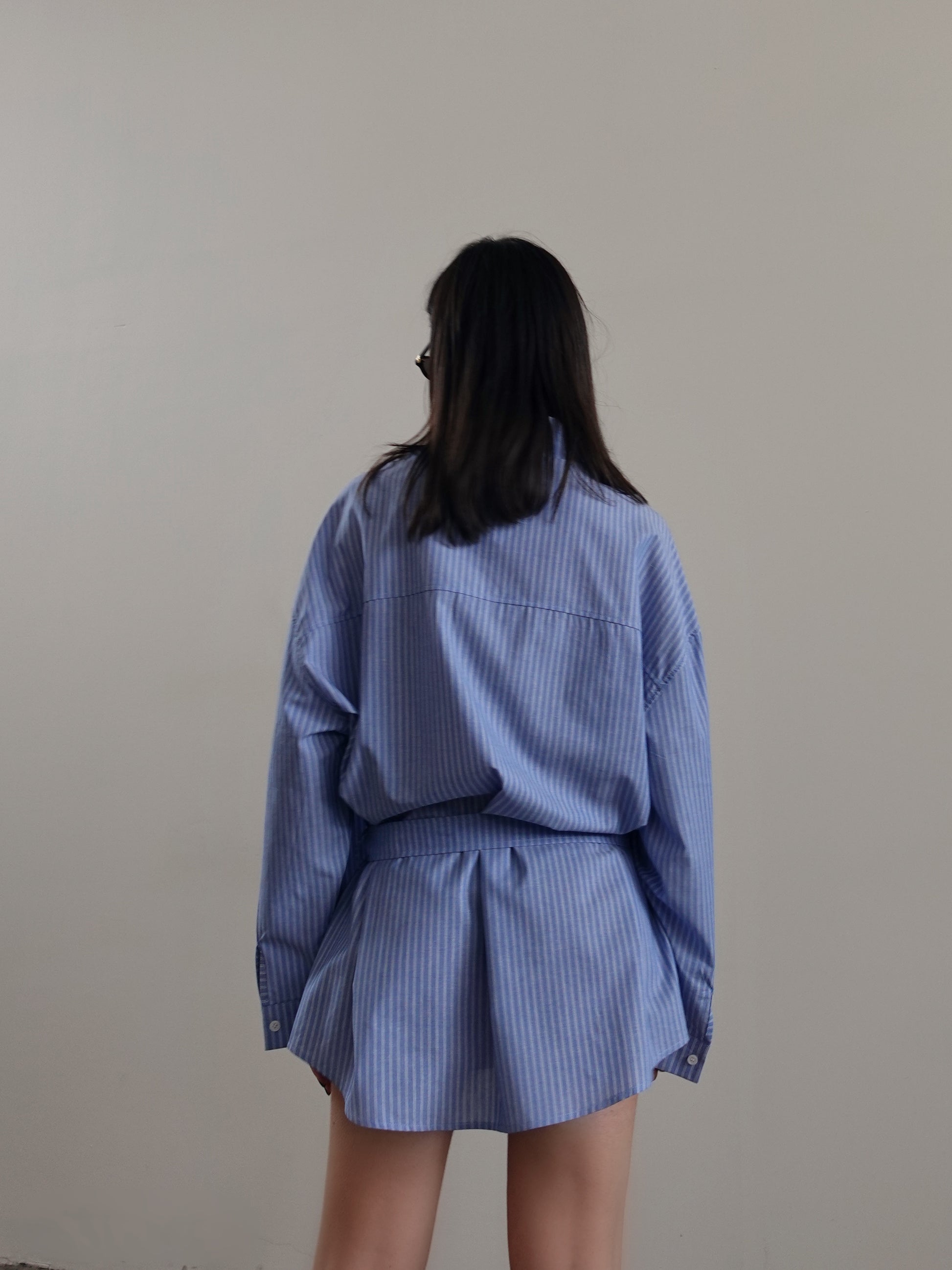 CAMICIA LUNGA A MILLERIGHE CON CINTURA - AZZURRO 19358