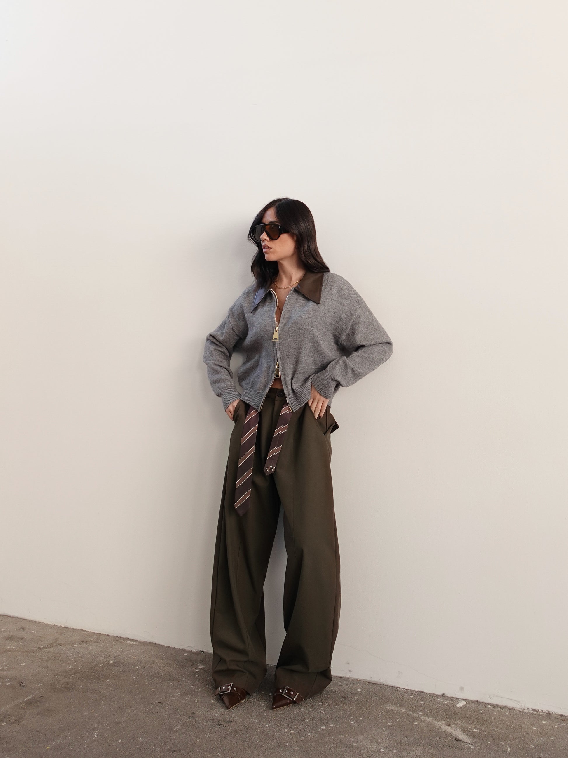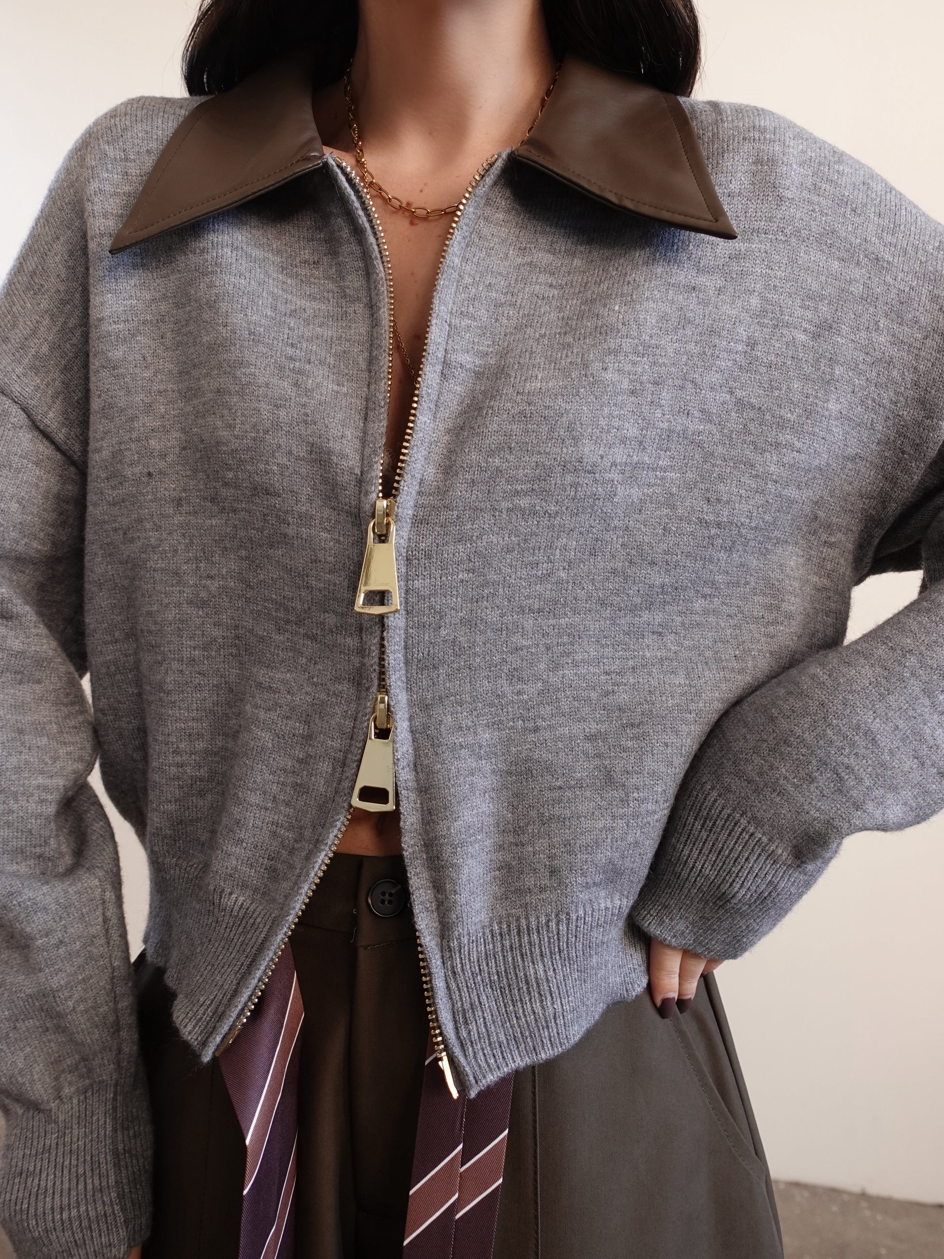 MAGLIONCINO CON ZIP E COLLETTO IN ECOPELLE - GRIGIO 14569